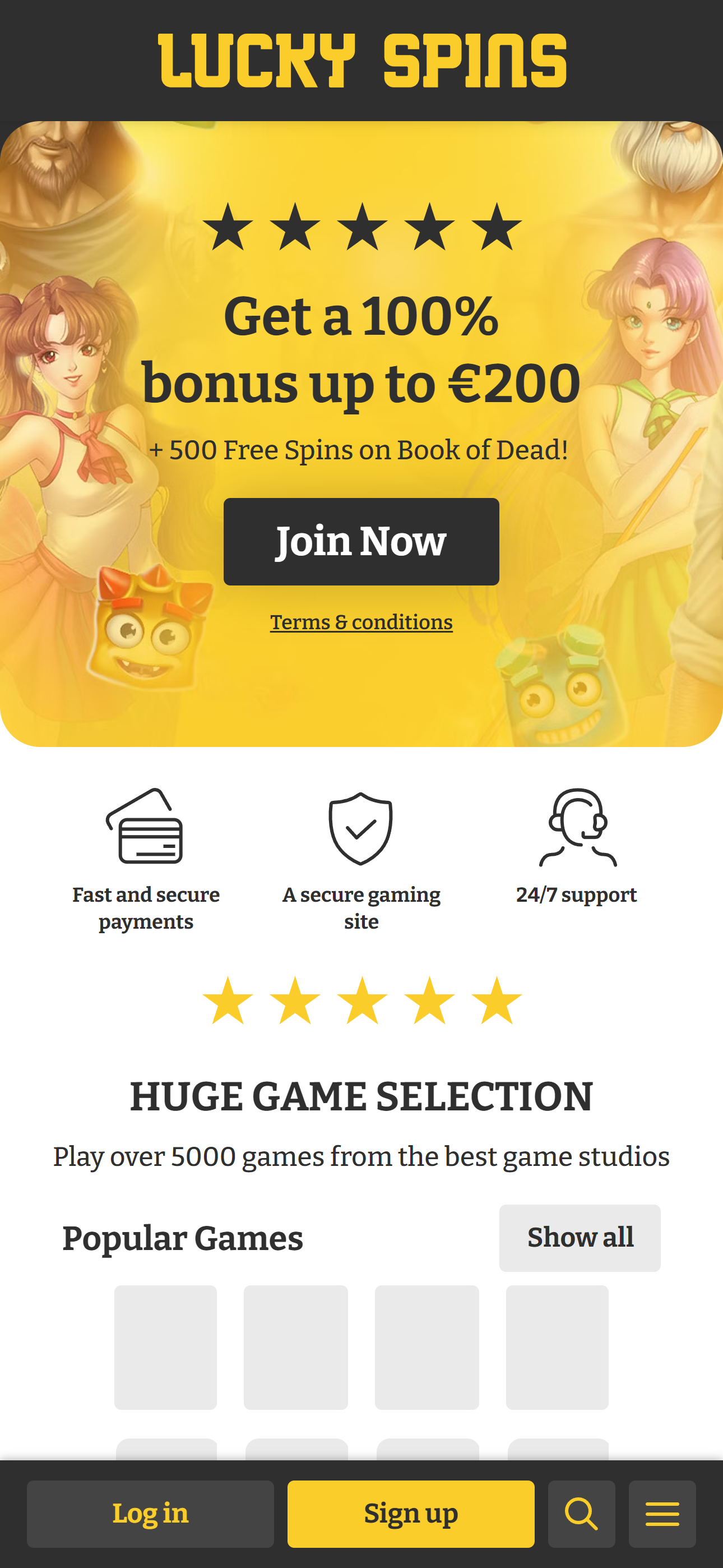 Oikeastaan ​​useimmat nettikasinot ovat nyt poistamassa bonuskoodeja käytöstä, ja Casitsu on yksi sivusto, joka tarjoaa niitä edelleen. Pelit ja ohjelmistot: uskomaton videopelivalikoima, jossa on yli 5 000 peliä. Videopelityyppi: Valikoima pelejä. Suosittuja nimikkeitä: Pokies 4 200+9. Masks of Fire, Huge Bass Sprinkle, Wild Flock 2 Jackpots 20+. Joker Jackpots, Rainbow Jackpots, Prize Mission, Blackjack 125+. Fast Multi-Hand Blackjack, Eclipse Blackjack, Blackjack Touch Roulette 150+. Vehicle. Live-ruletti, eurooppalainen ruletti, Live-ruletti Advanced. Muut pöytäpelit: 75+. Huge Baccarat, Casino Poker Side Wagers. Nettijakajapelit: 700+. Crazy Time, Speed ​​Roulette, SuperStake Blackjack. Yksi Lucky Spinsin merkittävistä eduista on sen valikoima – tarjolla on paljon,